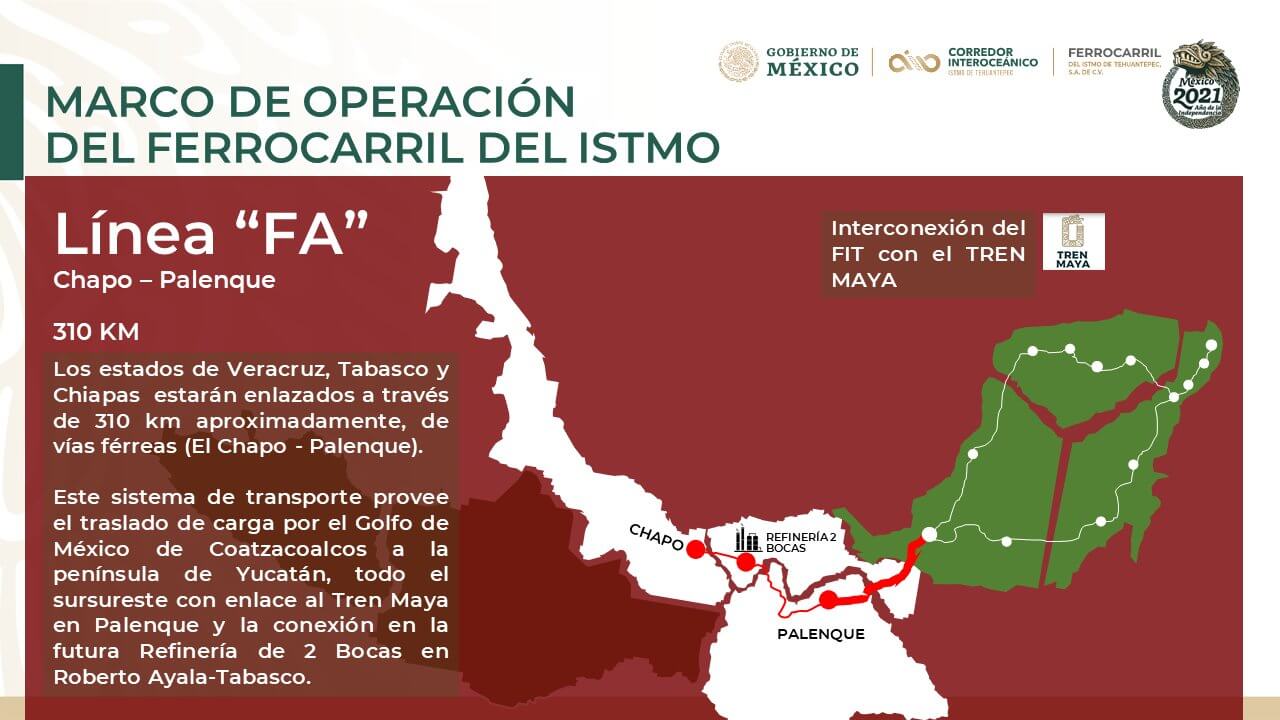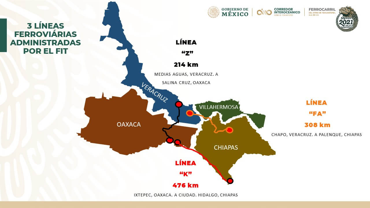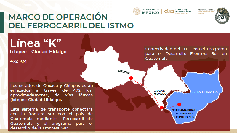 La Línea "K" recorre los estados de Oaxaca y Chiapas tiene 472 km de vía ferrea y se plantea que tenga conexión con el pais hermano de @Guatemala.